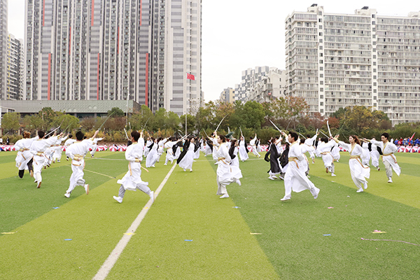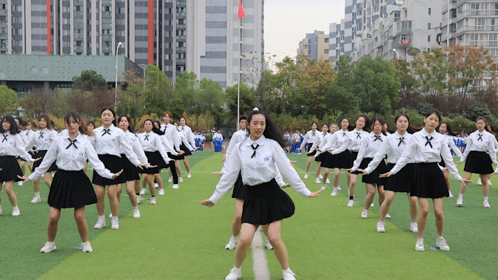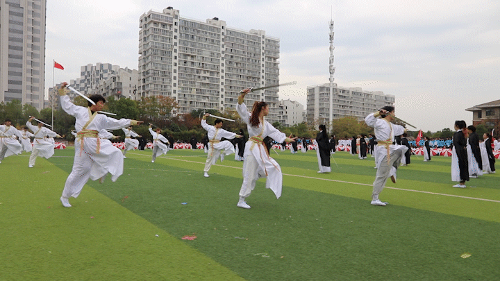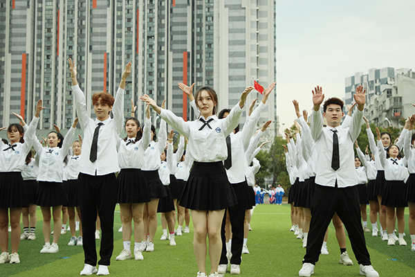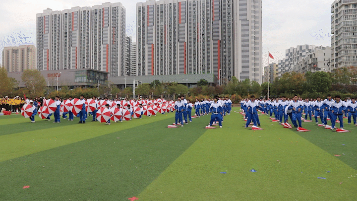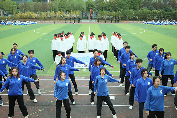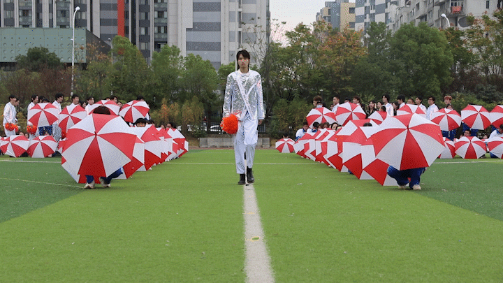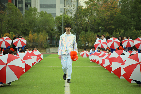 甜美的笑容、绚丽的服饰、优美的舞姿……传统与时尚结合,传承与创新交融,团体操、啦啦操、武术表演将运动会开幕式推向高潮。第一篇章“青春蓄势待发 人生扬帆起航”,伴着轻松明朗的旋律、清新明快的节奏,学生们用青春之舞扬帆起航;第二篇章“建功新时代 争做好少年”,300名学生以伞为笔,绘出“WIDS”图案,以满卷的自信之气挥毫写下浓墨重彩的印迹;第三篇章“激情炫舞绽放 青春活力飞扬”,身着蓝白色服装的时尚设计学院少年,迈着自信的步伐闪亮登场,以动感的T台秀展示大学生朝气蓬勃的青春活力和积极向上的精神气质;第四篇章“弘扬武术精神 燃烧火热青春”,在刀光剑影中,武术教研室的老师带着“武林高手”一展身手,武冠丰华,以自强精神振奋民族之魂,以火热之心燃烧青春之梦;第五篇章“青春创造奇迹 奋斗书写辉煌”,首届团体健身操舞冠军成龙影视传媒学院带来精湛动感、朝气蓬勃的团体健身操舞表演,队形变化丰富、动作整齐、造型优美……