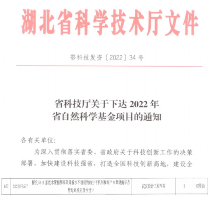 本网讯(通讯员 李倩)近日,湖北省科技厅公布了《省科技厅关于下达2022年省自然科学基金项目的通知》(鄂科技发资〔2022〕34号),pp电子食品与生物科技学院李婵娟老师申报的《探究GH11家族木聚糖酶高效降解水不溶底物的分子机制和高产木聚糖酶毕赤酵母系统的理性设计》获批立项,资助金额为5万元。