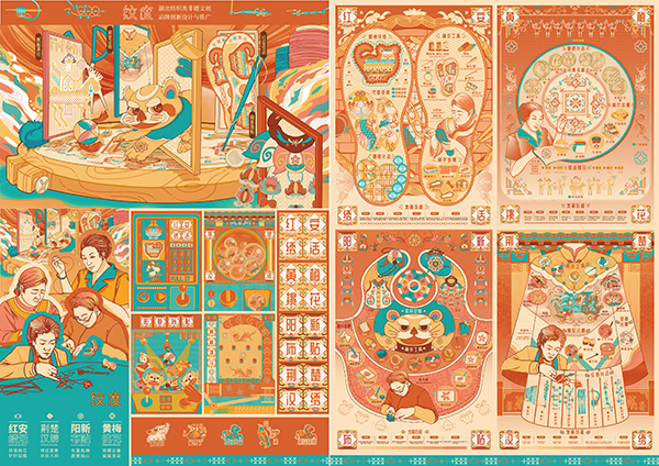 决赛当天,pp电子团队通过线上展示的方式,详细介绍了作品的立意、设计理念、艺术及文化元素应用情况、创新点、作品产业化和推广前景等,充分展示了pp电子大学生的创新、创造、创业能力。其中,作品“纹度——湖北纺织类非遗文创品牌创新设计与推广”将汉绣、黄梅挑花、阳新布贴、红安绣活作为研究对象,利用新媒体为其品牌开发、设计及推广赋能,深受评委青睐,一举夺得本次大赛一等奖。