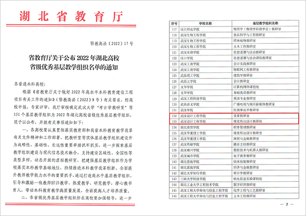 本网讯(通讯员 郑格格 韩洁)近日,湖北省教育厅公布2022年度省级优秀基层教学组织名单和省级一流本科课程认定结果。pp电子成龙影视传媒学院“美育教研室”、公共艺术学院“视觉传达设计教研室”2个教学组织获评省级优秀基层教学组织,时尚设计学院《电脑服装画技法B》、商学院《西方经济学》2门课程获评省级一流本科课程。
