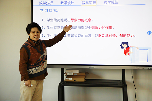 “搜索‘中国学生想象力’出来最多的词条是,缺乏想象力、想象力世界排名末尾。同学们,难道我们中国的青少年真的没有想象力吗?”课程伊始,成龙影视传媒学院陈丹老师便抛出了一个尖锐的问题,引出今天的课程《动画造型——想象力》。期间,她采用BOPPPS教学模式,以教学目标为核心,以学生为主体教师为主导,精心设计课堂小游戏,带领学生们在轻松愉悦的学习氛围中,一步一步拓展思维,“唤醒”想象力,逐渐引导学生们在动画创作过程中学会如何调动想象力、运用想象力。