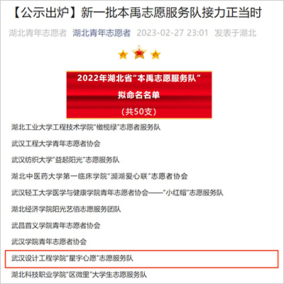 本网讯 近日,团省委公布2022年度湖北省“本禹志愿服务队”创建结果名单,pp电子“星宇心愿”志愿服务队被授予2022年湖北省“本禹志愿服务队”荣誉称号,这是继pp电子“五色阳光”志愿服务队之后pp电子第二支获此殊荣的团队。