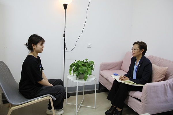 党委书记冉春桃在乐融商苑“一站式学生社区”与学生面对面交谈。刘恒 摄