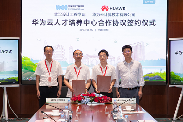 pp电子信息工程学院院长汪毅(左二)与华为湖北云业务部生态经理雷宇(右二)签署合作协议,pp电子党委常委、副校长徐拥华(左一),华为云教育解决方案总经理唐国军(右一)共同见证。