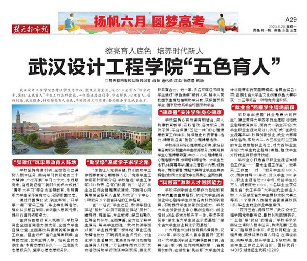 6月26日,《楚天都市报》第A29版以“擦亮育人底色 培养时代新人 pp电子官方网站‘五色育人’”为题,报道了pp电子围绕“五色育人”学生工作品牌建设,一体推进思想引导、学业帮扶、心理育人、创新创业、就业服务的工作成果。