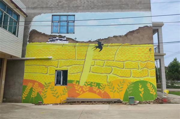 环境设计学院“美丽家园·共同缔造”——筑梦服务队监利分队结合当地水稻产业绘制的墙绘。