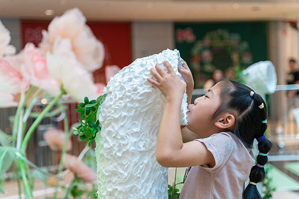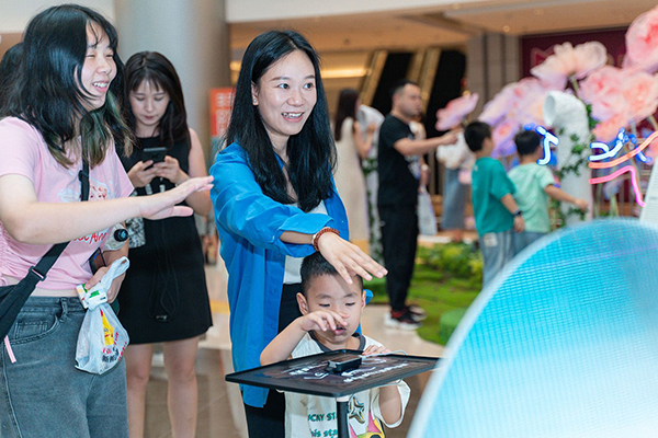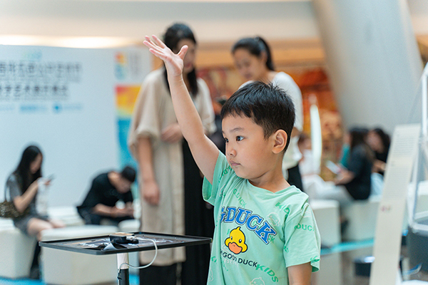 “amazing”“interesting”,只见来自爱尔兰的Michael带着两岁半的萌娃开启了一场“星空旅程”。孩子站在作品《H@lo 圈》装置踏板上,群星闪烁,形成不同的星座图像,仿佛置身于浪漫星空下,吸引着萌娃爱不释“脚”。“妈妈快看,这花会呼吸。”作品《Cyblow 生态之光》深受市民喜爱,观众对着气体感应装置不停地大口呼气,就可以助力花朵绚烂绽放。据策展秘书、公共艺术学院教师黄雅丽介绍,这件作品想要表达的主题就是人的呼吸离不开植物,人的生命离不开自然界。