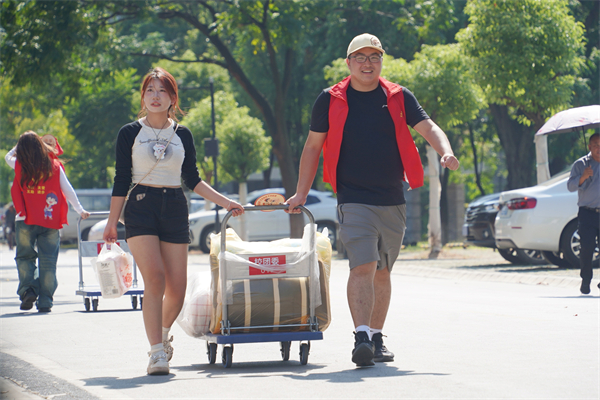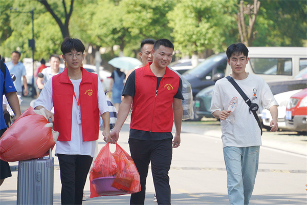 商学院2022级学生柯政是本次迎新志愿者的一员。他介绍说,一周前志愿服务队就已经做好了各项迎新准备工作,队员们也都经过了严格的培训,确保迎新工作万无一失。“记得去年我还是名新生的时候,看到学长学姐们帮助我搬行李、办手续,我深受感动。那种温暖和关爱一直留在我的脑海里。因此,得知这次迎新工作后,我毫不犹疑地报名成为一名志愿者。”他在采访中祝愿新同学,“‘新’装上阵,学有所成。”