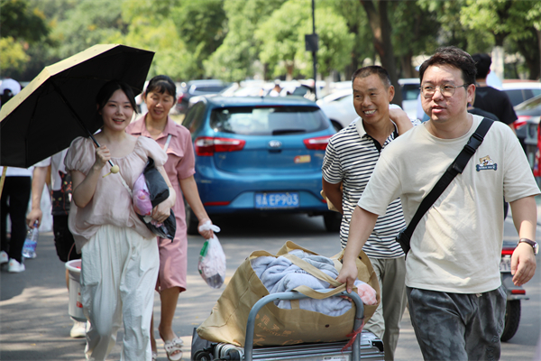 环视校园,处处洋溢着喜悦的笑脸,新同学和家长们在志愿者的陪同下,兴奋地讨论着学校里的一景一色、一草一木:道路两旁、建筑外墙拉起了各式各样的迎新横幅,热烈欢迎新同学的到来;各学院报到点一字排开,清晰明了;学生公寓干净整洁,学长学姐们热情地为新同学介绍洗衣房、生活超市等周边配套;湖心栈道、荷花池旁,家长们惊叹着天鹅的美丽和锦鲤的灵动。