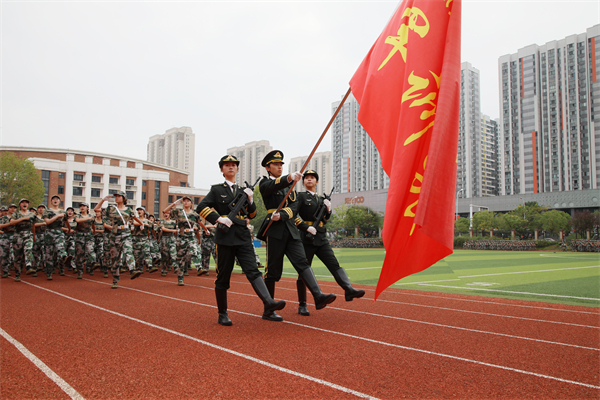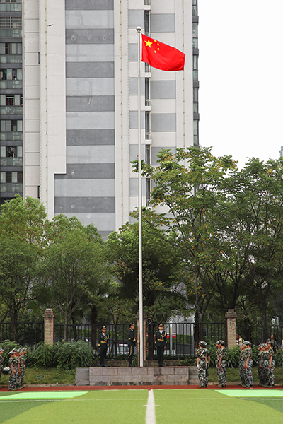 五星红旗冉冉升起,拉开开学典礼暨军训总结汇报大会的帷幕。汤昊霖 摄