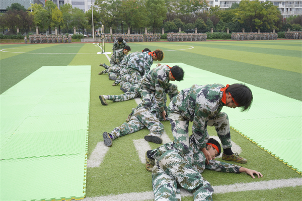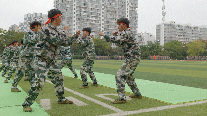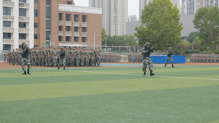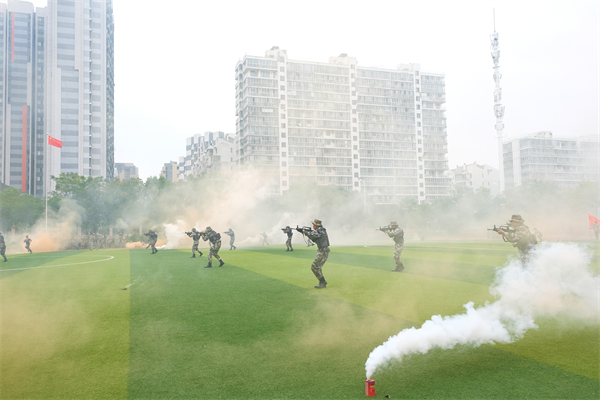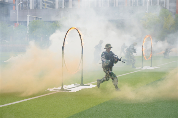 学生军事训练特色科目展示环节,女子匕首操、男子军体拳和战术表演依次进行。“尖刀利刃势破竹,一招一式气如虹”,女生队伍演练匕首操,横踹侧踢、抱拳立定、手持匕首、挥刀破风……同学们动作行云流水,眼神坚定,如同亮翅白鹤。男生队伍表演军体拳,拨挡冲拳、擒臂上勾、顶肘撞膝、击胸砍脖……屈肘合力长矛刺,神如利刃破天惊,同学们动作干脆利落,精神昂扬,如同下山猛虎。在战术综合演练中,12名新生们化身全副武装的战士,在一声声怒吼声中认真展示“踢、打、摔、拿”徒手格斗基本功,身手矫健、气势如虹。“硝烟起、战鼓擂”,在险象环生的迷雾中,“战士们”奋勇直前,他们手握钢枪,越过反坦克三角堆、穿过熊熊火圈,勇猛冲击、势不可当,顺利攻克“敌军”据点,“以一当十、力破千军,攻无不克、战无不胜”,英勇风姿赢来掌声阵阵。