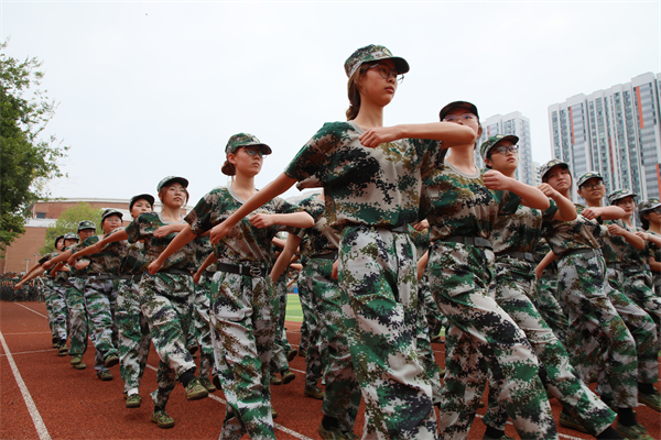 伴随着分列式进行曲,全体参训同学昂首挺胸、精神抖擞,依次走过主席台接受检阅。“骄阳不惧、奋勇争先,绿装红颜、勇往直前”他们喊着响亮的口号,迈着坚定的步伐,英姿飒爽、意气风发,充分展现了14天的军训成果和积极向上的精神风貌。