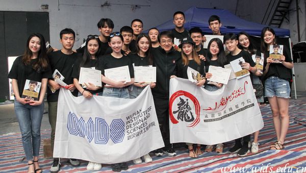 当天中午,在学校董事长程凡,副院长魏湧、毛春义等校领导的带领下,17名优秀毕业生来到《我的日记》拍摄现场。时值片场休息时间,成龙院长刚结束完上午半天的拍摄工作,得知学生来探班,他立即腾出时间出来迎接。