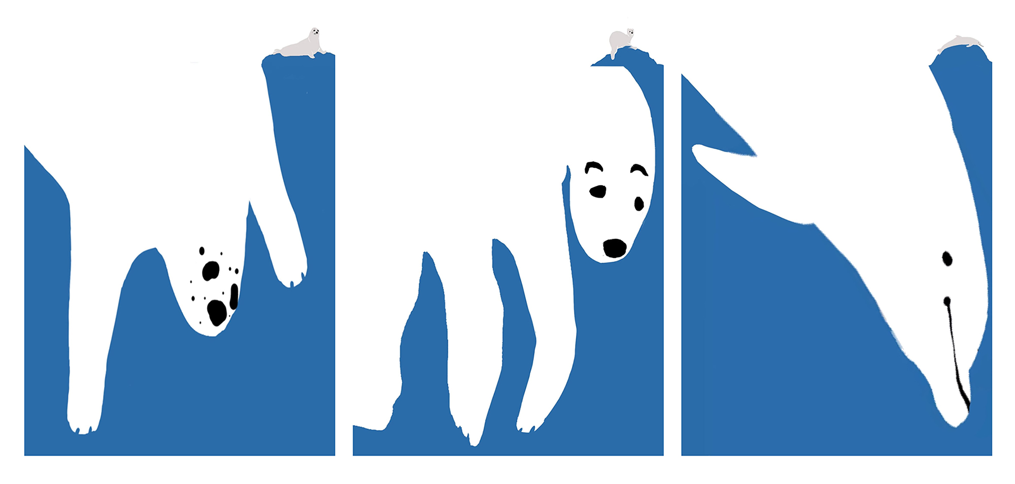 彭雨田作品《Fading tears》由“北极熊”“海豹”“海豚”三幅海报组成系列作品,设计灵感源于作者对气候变化和全球动植物栖息地丧失等问题的高度关注。彭雨田介绍,“海报主体看似一只大北极熊漂浮在海面上,实际上我用它来暗指融化的冰川。大北极熊头上还有一只小北极熊,它虚弱地趴在冰川上,眼中充满了无助和绝望,仿佛在呼唤人类的关注。”设计细节上,特意采用了蓝色调来强调冰川和水的清澈,让北极熊的白色毛皮与蓝色背景形成强烈对比,提升视觉冲击力。