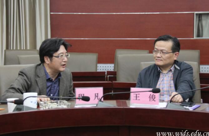 程凡董事长与王俊(右)副局长在调研会上交流。