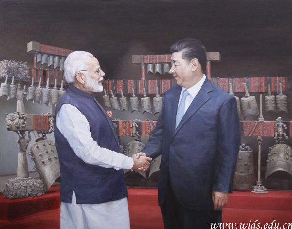 本网讯(记者 周惠明)日前,记者从藏龙美术馆获悉,该馆馆长欧阳德彪教授的画作《习莫会》被湖北美术馆收藏。据介绍,《习莫会》是一幅宽1.9米、高1.4米的油画作品,画面以湖北省博物馆镇馆之宝——曾侯乙编钟为背景,中印领导人在编钟前亲切握手。