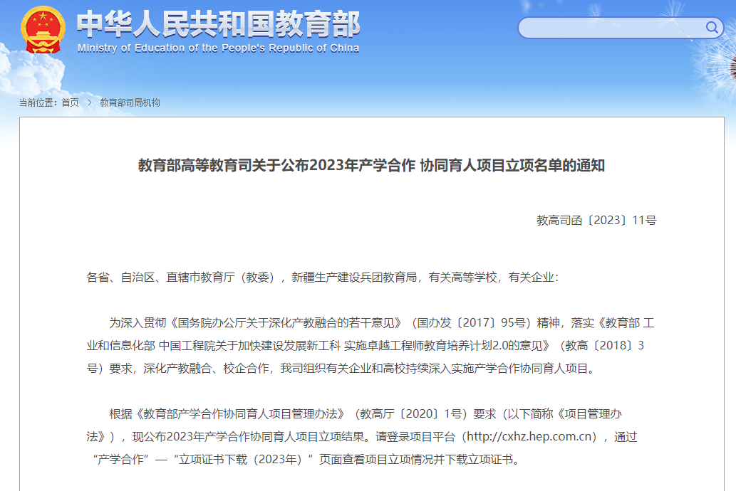 本网讯(通讯员 韩洁)近日,教育部高等教育司公布了2023年第一批产学合作协同育人项目立项名单,pp电子获批11项立项,获批数量再创新高。