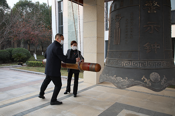 学校党委书记冉春桃,党委副书记、校长龚少平共同敲响警示钟。刘恒 摄
