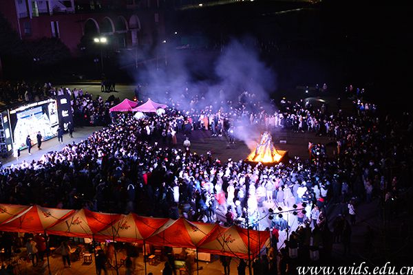 学子们手拉手围着篝火唱歌起舞。邓奕鹏 摄