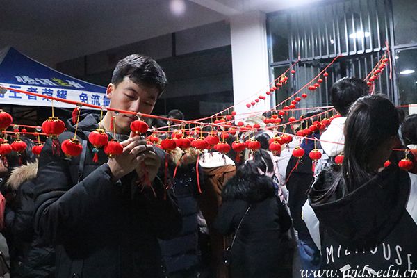 猜灯谜游戏一如既往地受到同学们的热爱,大家三三两两地聚在一起讨论谜底,欢乐的笑声萦绕着小灯笼,尽是喜气洋洋的景致。在布袋跳游戏中,许多同学展现出冬季难得的灵活,为了胜利,也是拼了。晚上10时许,在图书馆一楼兑奖区域,已是人山人海,不少同学带着奖品满载而归。