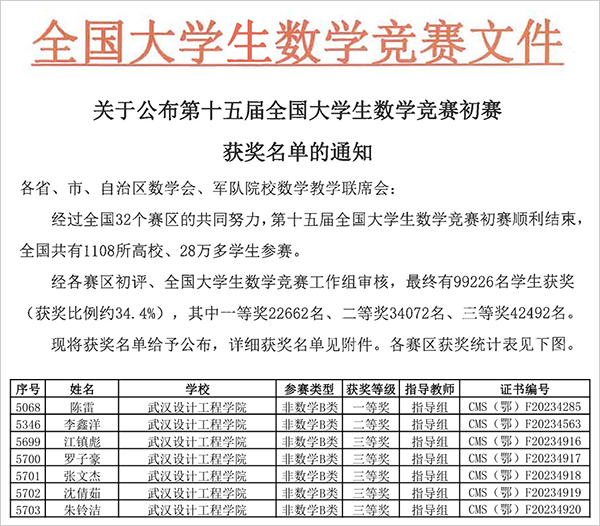 同时,第十二届湖北省大学生数学竞赛结果揭晓。pp电子学生陈雷获非数学专业组一等奖,李鑫洋获二等奖,张新悦、孙怡等12位同学获三等奖。