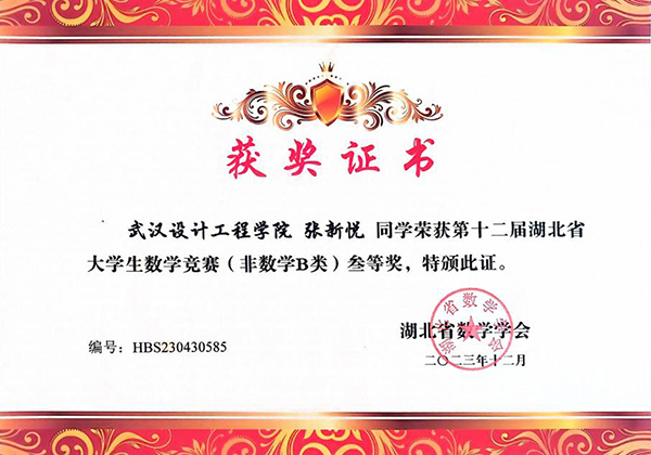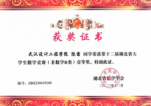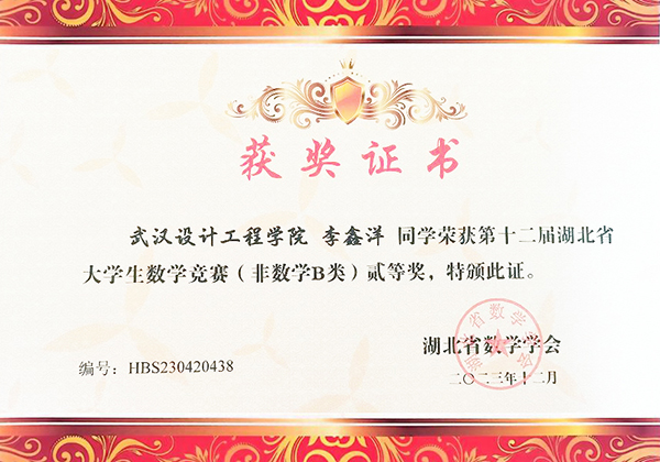 第十二届湖北省大学生数学竞赛部分获奖证书。