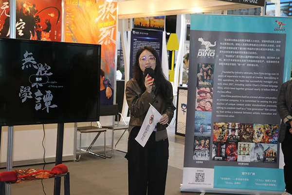 《无腔不学谭》作品指导教师、电影监制鲍海姗在第28届香港国际影视展湖北展区向现场观众介绍影片内容。