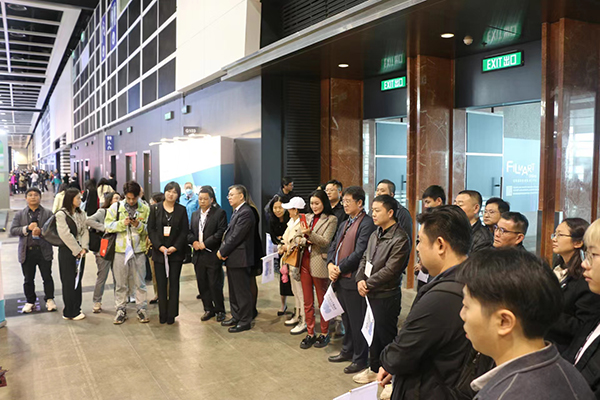 第28届香港国际影视展开幕现场,香港贸易发展局、湖北省商务厅领导与湖北展区代表及《无腔不学谭》创作团队合影。