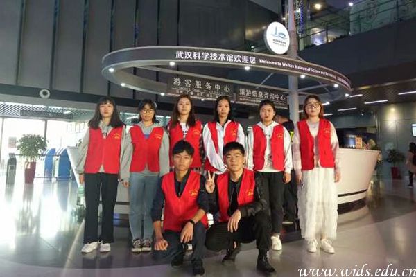 欧团魁在武汉市科技馆和志愿者队友合影。