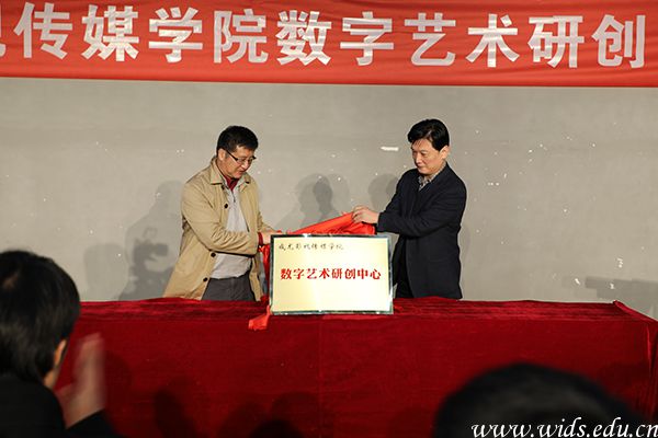 武汉动漫协会会长张敏和pp电子董事长程凡为“成龙影视传媒学院数字艺术研创中心”揭牌。刘恒 摄