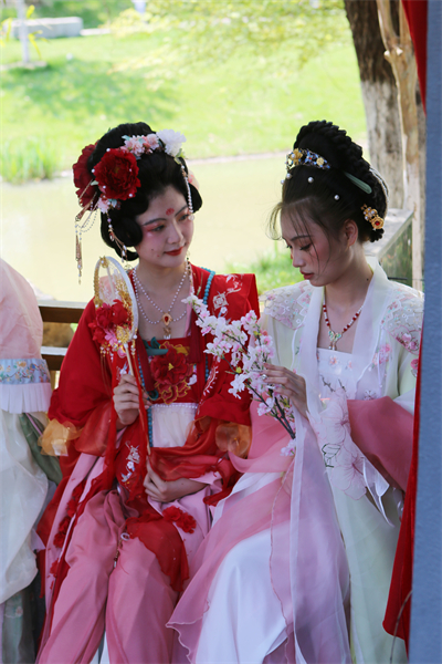 “在制作过程中,设计师们敏感地捕捉到每一种花的花形花姿,利用印染、刺绣等传统制作工艺,将它们的瑰丽形象优雅地呈现在服装的每一处细节里。”梅花花神扮演者赵毓同学向记者展示自己衣袖上的精美设计元素。她表示这次活动非常有意义,让更多的人关注汉服、了解汉服,也为中国传统节日的传承与创新贡献了设计的力量。