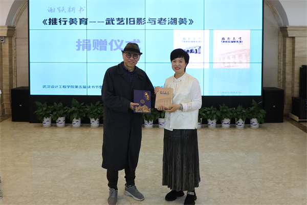 公共艺术学院执行院长谢跃(左)捐赠个人新作《推行美育-武艺旧影与老湖美》。刘恒 摄