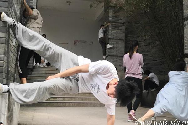 5月24日起,在进行了经典环境舞蹈的视频教学后,戏剧表演舞蹈班的同学们在Colette和Matt两位外教的指导下,开始了环境舞蹈的实践教学练习。这一天,他们来到了咏归教学楼的走廊上,Colette说:“我们应该选择一个场景地点作为你接下来要发生联系的‘舞伴’,比如这个方柱,我就该对待它像对待我最亲密的伙伴一样,信任量它,并且把全身的重放在它身上,起到一个信任的作用。我可以在它任何地方完成我的表演动作。”Colette老师强调,环境舞蹈的重点是把握环境,同学们要从了解环境入手,到逐渐熟悉环境、信任环境、与环境相融,最终达到与环境“共舞”。接着,Colette、Matt同时为大家做了精彩和准确的示范,并要求同学们在自己选择的地点连贯而轻盈地完成“重心接触点”的练习。