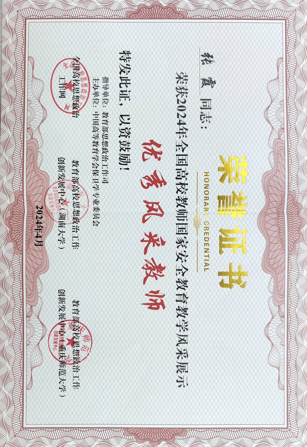 马克思主义学院教师张霞获评全国高校教师国家安全教育教学风采展示“优秀风采教师”。