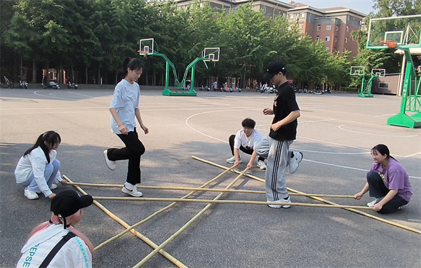 同学们踊跃体验壮族“跳竹竿”。