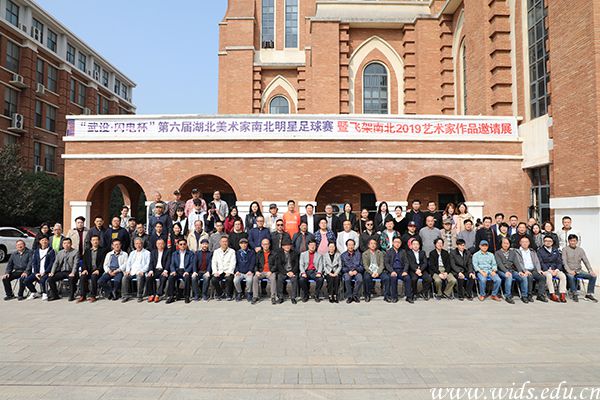 一边是典雅大气的画展,一边是活力十足的足球赛,一静一动之间,尽展艺术与体育相融合的独特魅力。当天上午,在赛车海报展如火如荼之际,“武设·闪电杯”第六届湖北美术家南北明星足球赛暨飞架南北 2019 艺术家作品邀请展在藏龙美术馆同期开幕。80余位知名艺术家齐聚学校,将个人艺术作品向师生展出的同时,以球会友、以艺聚贤。