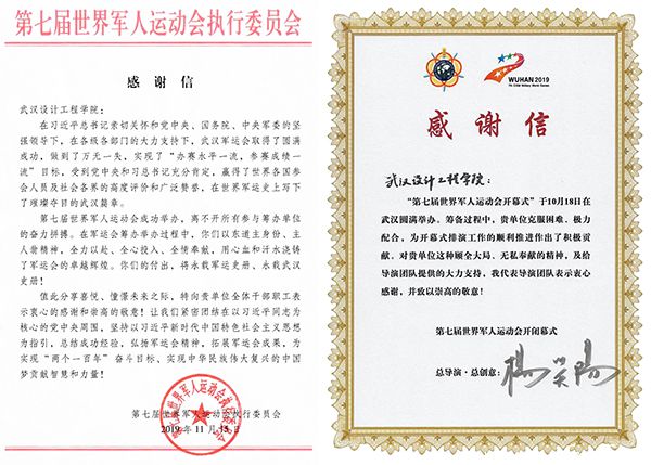第七届世界军人运动会开闭幕式总导演、总创意杨笑阳在感谢信中表示:“筹备过程中,贵单位克服困难、极力配合,为开幕式排演工作的顺利推进作出了积极贡献。对贵单位这种顾全大局、无私奉献的精神,及给导演团队提供的大力支持,我代表导演团队表示衷心感谢,并致以崇高的敬意!”