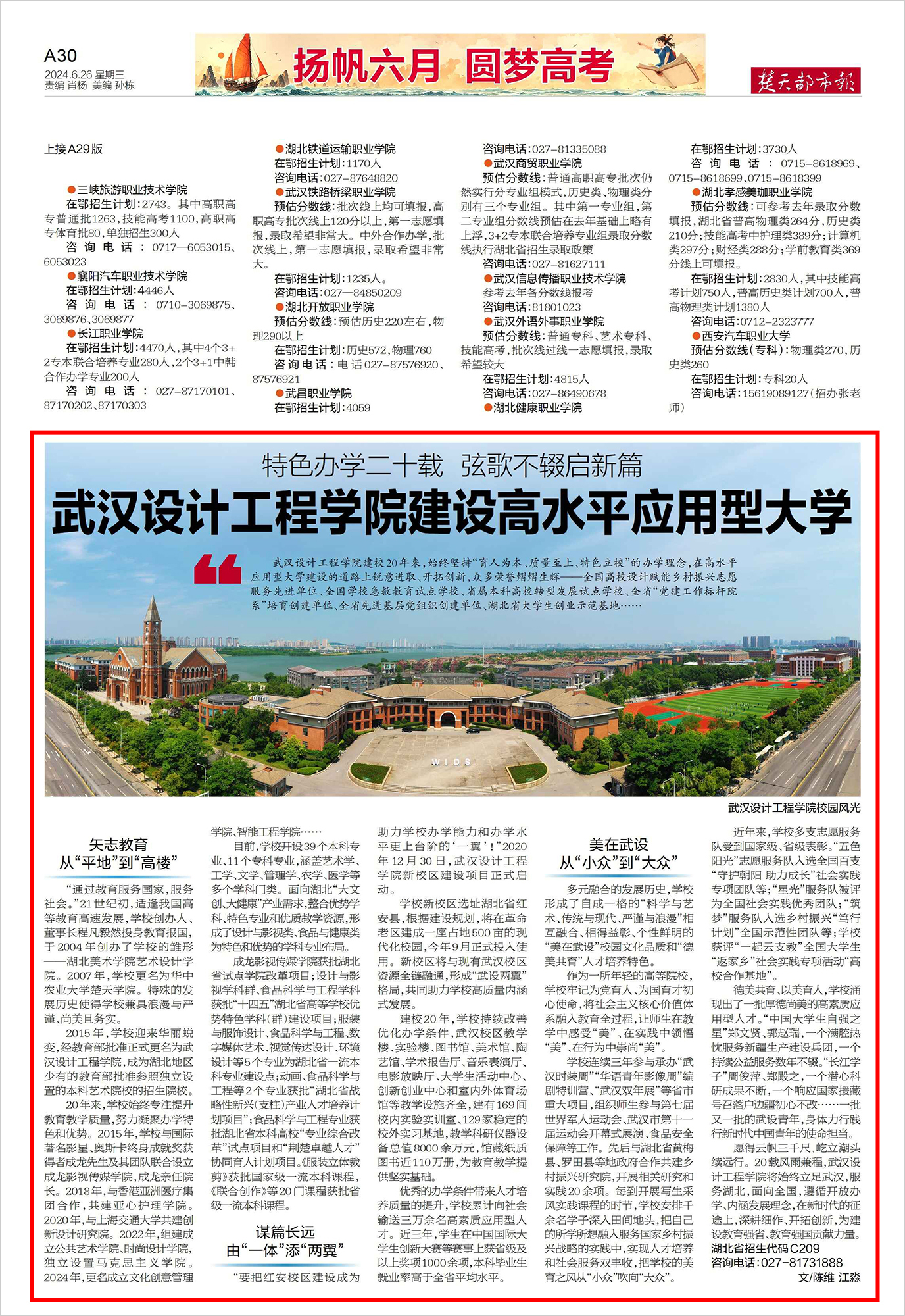 6月26日,《楚天都市报》A30版,报道pp电子建校20年来,始终坚持“育人为本、质量至上、特色立校”办学理念,在建设高水平应用型大学的道路上锐意进取、开拓创新,弦歌不辍。