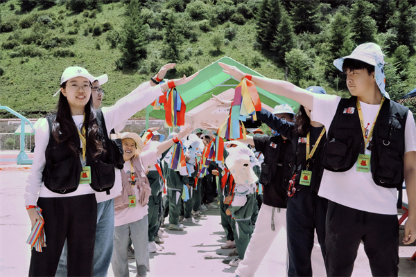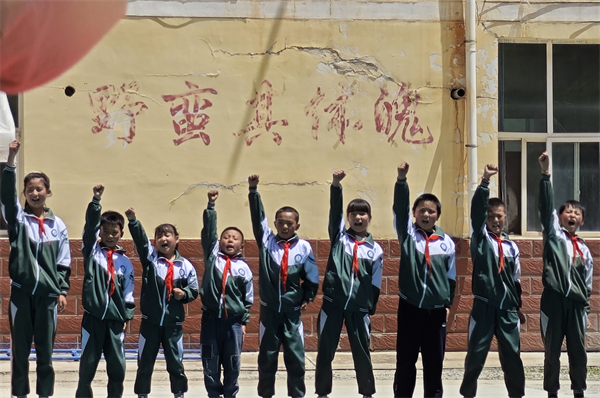 瓦结小学的孩子们以“友谊之桥”方队的形式,热烈欢迎来自青土小学的同学们。
