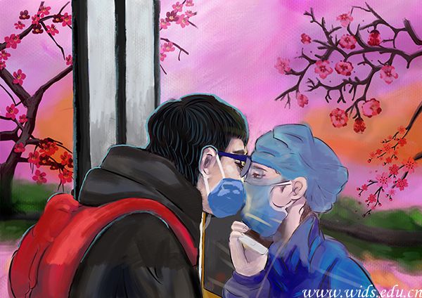 工艺美术专业学子吴凌创作的电脑插画《隔离病毒·不隔爱》。