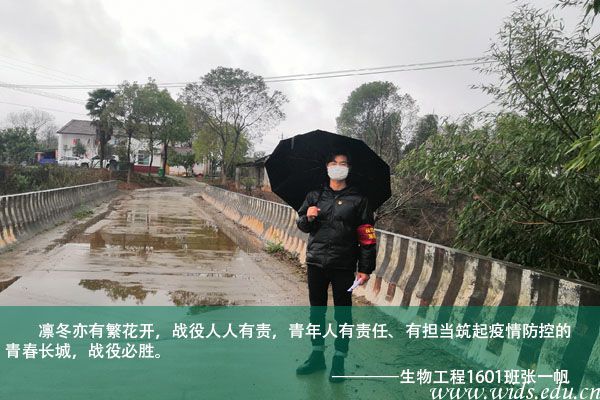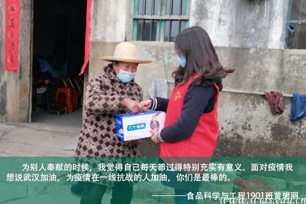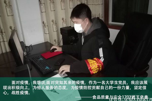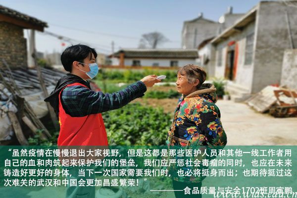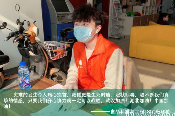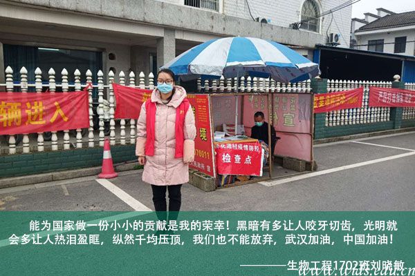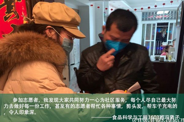 还有生物工程1601班张一帆、食品质量与安全1701班袁志宏、食品质量与安全1802班张宇娟、食品科学与工程1801班马驰,他们也在家中协助社区工作人员登记居民的返乡离乡人员信息、卡口出入人员信息、体温信息等各类信息和上报。马弛一边忙着在家乡成都参加志愿者助力战疫,一边不忘用自己的创意为武汉加油,在疫情最严重的的时候,他动员身在各地的武设学子拍摄视频为武汉加油,短短两天时间,就有六十多位同学响应,剪辑出来的视频还受到了人民网的报道。