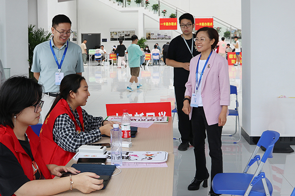 校长龚少平(右)在迎新现场询问迎新工作情况。