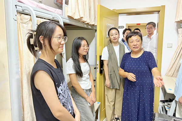 党委书记冉春桃(右四)、校长龚少平(左三)走访学生宿舍,看望2024级新同学。