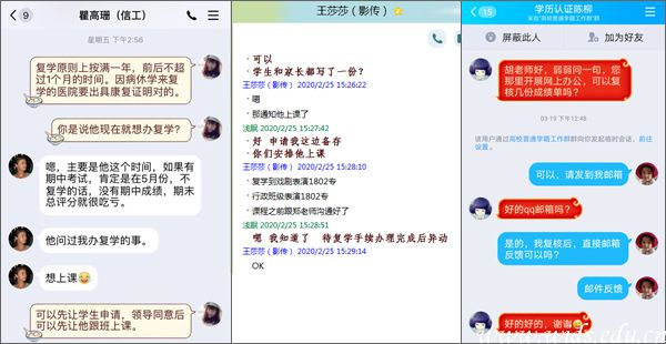 疫情期间,学籍科胡艳红、贺芳两位老师更是克服办公困难,不断强化主动服务意识。她们全天在线,坚守工作原则,灵活有效地处理学籍管理日常事务,保障学生学籍管理与服务工作不断线,为确保师生出国留学、考研复试、工作面试等需要,她们24小时为学院、教师、学生提供相关政策咨询解答、及时根据学生需求提供成绩单等学籍证明材料、在线审核学生复学申请、及时让符合条件的学生先行进入课堂学习等等。