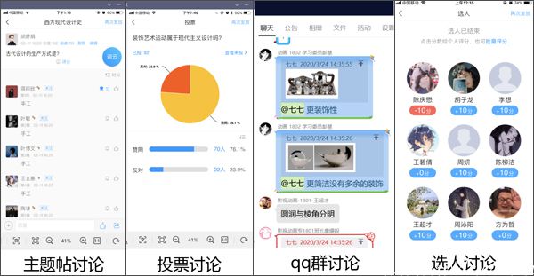 与多数老师不同的是,公共基础课部胡舒娟老师对在线教学经验更丰富,由她负责的《艺术设计概论》课程在2019年就已经完成了拍摄制作,现在已经作为pp电子精品在线开放课程,参加省级一流课程评选,并在超星学习通平台、中国大学慕课平台上线,供全国大学生学习。胡舒娟老师本学期承担了《西方现代设计史》九个课堂的教学任务,在上课之前,她对课程内容再次精心备课,做好全面充分的在线教学准备工作。在教学过程中,胡舒娟老师认为要牢牢把握学生的主体作用。她针对授课内容的不同教学要求,采取分段式教学方法,也通过看、考、听、说等不同学习方式,调动学生积极参与课堂学习。胡舒娟老师还特别注重课堂互动,仅仅在课堂讨论环节,采取主题贴讨论、投票讨论、扣扣群讨论、选人讨论等多种方式鼓励学生动手动脑;再通过课前测试、课后测验和章节考试进一步了解学生学习情况,确保教学质量。