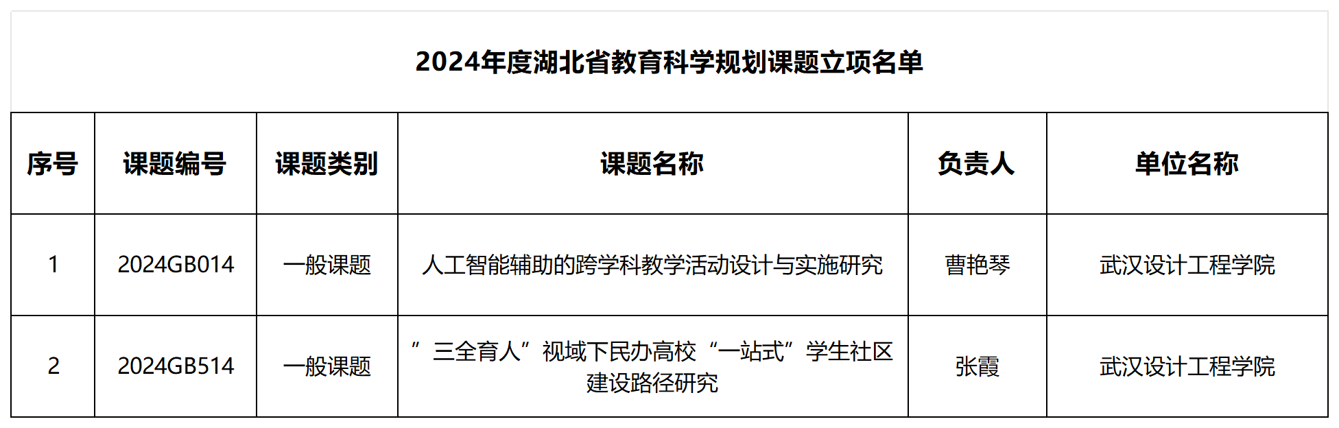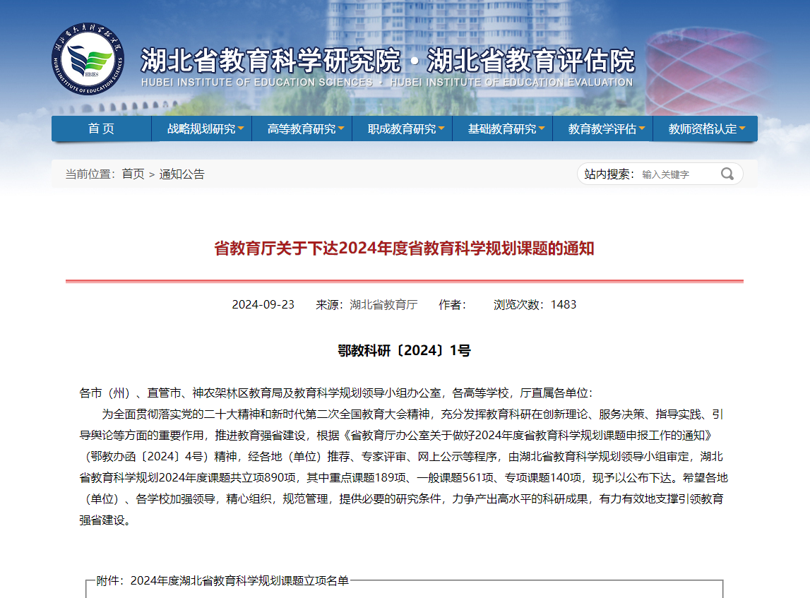 据了解,2024年度湖北省教育科学规划课题申报工作共立项890项,其中重点课题189项、一般课题561项、专项课题140项。本次课题申报工作,聚焦我省教育改革发展取得的卓越成就、实践经验,以及在实施“十四五”教育事业发展规划过程中所面临的实际问题,具有鲜明的时代特征、问题导向和创新意识,旨在推出高水平、具有特色的教育科研成果。