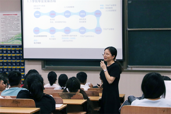 “这是一门融合了计算机科学、市场营销学、管理学、经济学、法学和现代物流学于一体的新型交叉学科。”在文化创意管理学院新生入学专业教育课上,经贸与管理系主任郭若艺、文化与旅游系副主任黄志斌分别向新生们详细介绍了学院专业的发展现状,全面解读了各专业的人才培养方案,并分享展示了学院在教育教学方面的创新举措和实践成效。不少新同学在听完介绍后表示,对本专业的发展前景有了更加深刻地认识,对未来的学习目标也有了更加明确的规划。