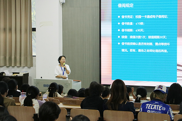 图书馆代星老师为公共艺术学院新同学进行图书馆资源与服务导览讲解。周佩 摄