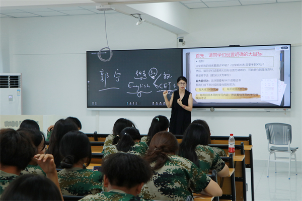 经贸与管理系主任郭若艺、文化与旅游系副主任黄志斌,为新生做入学专业教育。周佩 摄