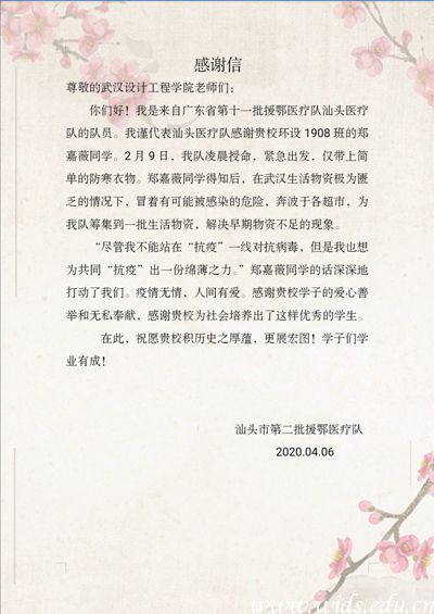 近日,pp电子收到一封来自汕头市第二批援鄂医疗队发来的感谢信,信中感谢环境设计专业1908班的郑嘉薇同学在疫情期间,不惧危险,积极为医疗队筹措生活物资的奉献精神。